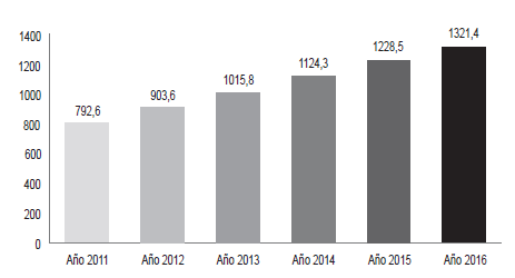 El número de compradores por Internet en el mundo se muestra en la Figura 6 (pag. 132), en el periodo 2011 a 2015 y las estimaciones para 2016. Los datos señalan un crecimiento del 55% en el número de personas que compran por Internet en cinco años, y estiman un crecimiento del 7,5% para el año 2016. De manera que el número de compradores pasaría de 792,6 millones a 1.228,5, mostrándose un proceso de crecimiento.