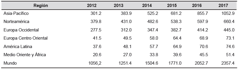 En la Tabla 1 (pag. 131) se observa cómo Asia-Pacífico viene incrementando sus ventas por Internet pasando de 301,2 billones de dólares en el año 2012 a 681,2 billones de dólares en 2015. Las estimaciones esperan que para 2017 las ventas en esta región sean de 1.052,9 billones de dólares, superando a Norteamérica, de quien se esperan ventas por 660.4 billones de dólares y Europa Occidental con 445,0 billones de dólares. América Latina continuará con un crecimiento conservador que exhibe 37,6 en el año 2012 con un crecimiento al año 2015 de 64,9 billones de dólares. Se estima al año 2017 ventas por Internet de 74,6 billones de dólares. De hecho, la pregunta anterior empíricamente empieza a tener respuesta para América Latina.