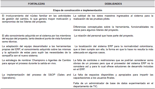 Con base en el análisis cuantitativo y cualitativo de las entrevistas y encuestas aplicadas al personal de la organización se obtuvo la matriz de fortalezas y debilidades (Tabla 3, pág.295 y 296) relacionada con las actividades desarrolladas en el proceso de implementación del sistema ERP en la empresa Comestibles SAS.