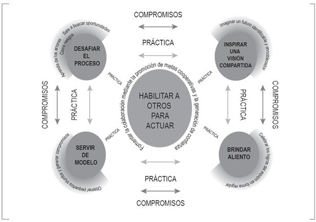 Teoría de liderazgo transformacional deKouzes y Posner (2005). Esta propuesta se fundamenta en el reconocimiento de cinco prácticas que permiten el desempeño exitoso de los líderes. La metodología de análisis de casos y encuestas permitió observar desempeños altamente valiosos de personas del común, que lograban efectuar las cinco prácticas referenciadas. Mendoza (2005) presenta las cinco prácticas y les añade unas actividades, asociadas a cada una; además de diez compromisos de liderazgo, para construir la matriz explicativa del modelo, representada en la Figura 1.