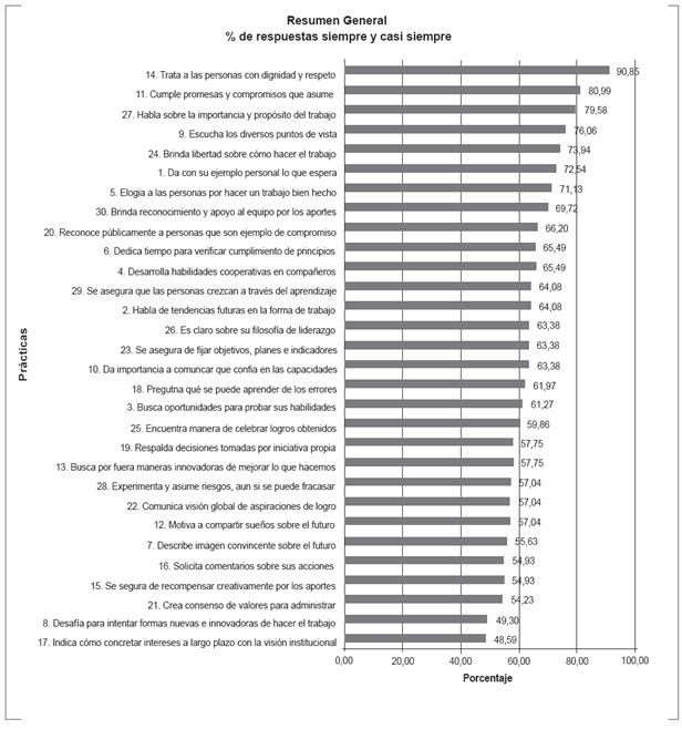En dicha figura, tomando los resultados por dimensión, las prácticas con respuestas de siempre y casi siempre superiores al 70%, tienen la siguiente distribución: la dimensión Habilitar ocupa el primer lugar con tres (43%); siguen en su orden Modelar con dos (29%); y Alentar y Desafiar con una (28%) respectivamente; la dimensión Desafiar no tiene preguntas superiores a este rango.