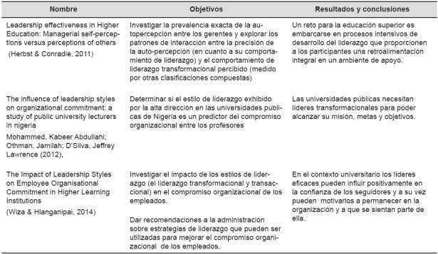 Como antecedentes a este trabajo para el caso Colombia, se encuentran los estudios desarrollados por Sepúlveda (2009), Sierra, Ortiz, Rangel & Alvarado, M. (2010) y Cortés (2012), quien han evidenciado que el liderazgo transformacional impacta favorablemente al clima organizacional, a los subordinados, y a los estudiantes, específicamente al relacionarse con los docentes. Además se pueden mencionar otros trabajos con sus resultados en la Tabla 1.