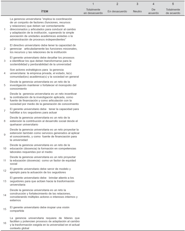 Para demostrar teóricamente la importancia y pertinencia del Liderazgo Transformacional en la gerencia universitaria para enfrentar el cambio y la transformación universitaria, se construyó un formulario con l6 preguntas cerradas, surgidas del análisis deductivo sobre las teorías del Liderazgo Transformacional, la Gerencia Universitaria, y los artículos científicos y tesis doctorales relacionados con antecedentes sobre los temas en mención. Dicho formulario se denominó "Matriz yValidación Liderazgo Transformacional gerencia Universitaria", el cual se aplicó a los expertos en Gerencia universitaria.
