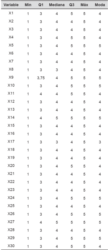 Se le asignó un número consecutivo, desde l hasta 30, al listado de las afirmaciones. También se definió una escala de medición para las posibilidades de respuesta de 1 a 5 con un esquema tipo Likert.
