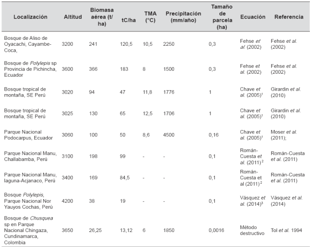 En páramos, el carbono en biomasa varía entre 13,21 y 183 t/ha. (Tabla 1). Algunos estudios sugieren que esta diferencia puede deberse a variaciones ambientales. Por ejemplo, se reportan correlaciones positivas y débiles entre biomasa aérea con la temperatura media anual, precipitación media anual, altitud y ángulo de pendiente (Spracklen et al., 2014). Sin embargo, otros estudios indican ausencia de correlación de biomasa aérea con variables climáticas y topográficas (Slik et al., 2010).