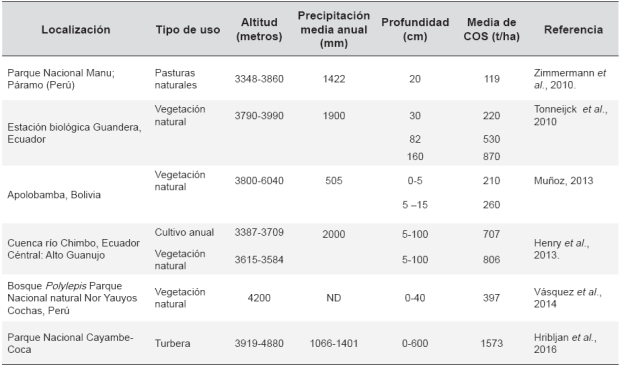 En el ecosistema de páramo, entre 0 y 40 cm de profundidad el carbono almacenado en el suelo puede variar entre 119 y 397 t/ha, bajo vegetación natural (Tabla 2). En turberas (bo-fedales o peatland, en inglés) a profundidad de 6 metros se alcanzan en promedio 1.573 t/ha (Tabla 2). Posiblemente los valores más elevados de COS bajo vegetación natural se deban a la mayor protección de la superficie del suelo propiciada por el tipo de cobertura vegetal. Por ejemplo, sitios con densas coberturas como las briofitas y especies arbustivas que aíslan el suelo de factores como precipitación e incidencia directa de radiación solar, pueden presentar mayor cantidad de carbono orgánico, porque hay menor descomposición de materia orgánica. Así mismo, la mayor densidad de raíces característica de estos vegetales puede influir en los valores altos de COS. Mientras que suelos bajo coberturas más dispersas, como pastos naturales de las familias Asteraceae, Poaceae, Pterydophyta posiblemente aporten menor cantidad de biomasa subterránea al suelo y faciliten una mayor descomposición de materia orgánica (Zimmermann, 2010, Tonneijck et al., 2010).