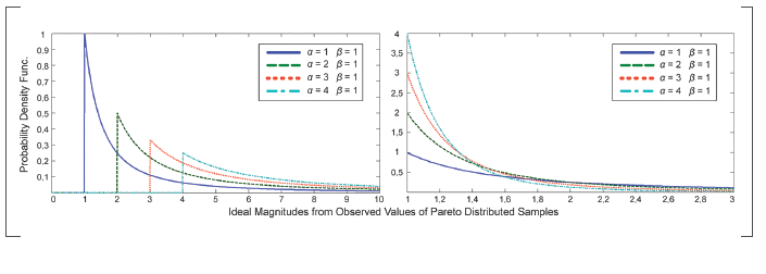 Where α is the shape parameter and β is the scale parameter (G. V. Weinberg, 2011), also referred to as location parameter or x - minimun value (O'Connor, 2011). The β parameter specifies the region where the distribution exists, which always covers the interval [β,∞] . Meanwhile, the shape parameter controls how fast the tail of the distribution falls. Figure 1 shows the effect of the variation of the parameters on the Pareto PDF.