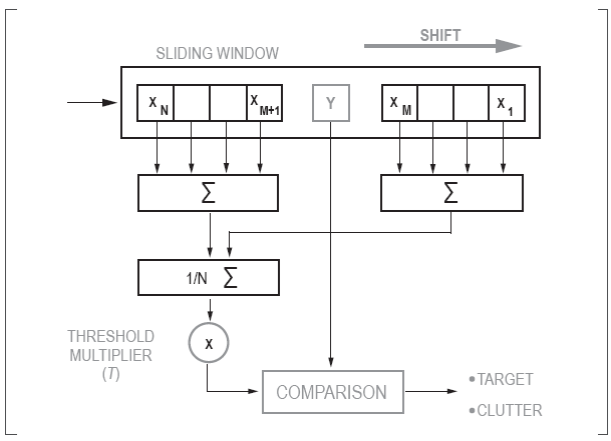The internal structure of the classical CA-CFAR processor is shown in Figure 2 (Rohling, 1983). It consists of a sliding window that moves throughout the radar coverage area, giving each resolution cell an opportunity to occupy the slot under evaluation (Y ). The detection threshold is calculated by averaging the Xn cells and multiplying the result by T. The detector indicates the presence of a target in the slot under evaluation if the magnitude of Y exceeds the calculated threshold (Machado Fernández & Sánchez Rams, 2016).