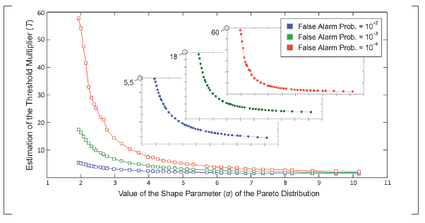 Undoubtedly, the main contribution of the paper is the finding of mathematical expressions for estimating the optimal CA-CFAR threshold multiplier factor for any occurrence of the Pareto shape parameter in the 2 < α <10 interval. The found Tvalues are acceptable when compared with others offered in similar studies (Machado Fernández, 2015; Machado Fernández & Bacallao Vidal, 2016a; Machado Fernández & Bacallao Vidal, 2016b) and they ensure that the CA-CFAR will operate with a reduced Pf deviation, whenever the shape parameter is known a priori, even if the clutter exhibits statistical variations.