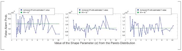 Next, the authors created a new set (Set B) with the same dimension of Set A but completely independent from it. The T values found with the Set A were used to process the samples from Set B in order to find the deviation experienced in the false alarm probability. The results are plotted in Figure 4 for Pf =102, Pf =103 and Pf=104.