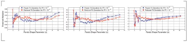 The mean deviation for P- = 102 was 3,3866 104 for the power fit and 1,6708-10-4 for the rational fit. The numbers were 1,3445-10-4 and 8,7868-10-5 for P- = 10-3; and 3,6421-10-5 and 2,9789-10-5 for P- =10-4.