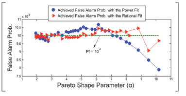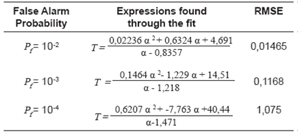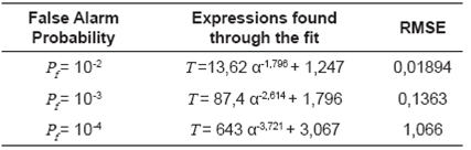 Moreover, Figure 5 shows the accuracy achieved by the two fits. Both alternatives showed a good proximity to the data. Nevertheless, the numerical comparisons indicated that the power fit was slightly more accurate for Pf= 10 2, and slightly worst for the other two false alarm probabilities.