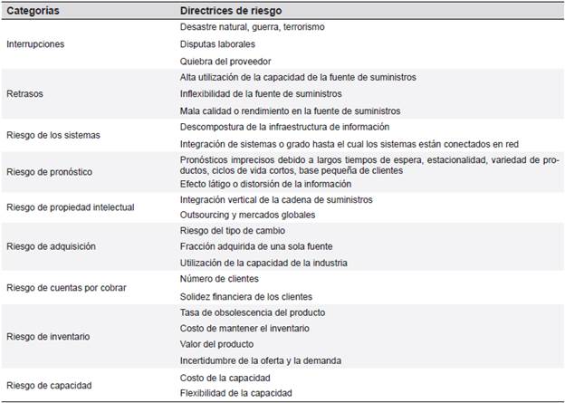 De otro lado, en lo referente al estado del arte del concepto de riesgo en la cadena de suministros, Chopra y Meindl (2008) indican que la incertidumbre aumenta en varias partes de la cadena de suministro, debido a diversos factores, cuando entran en escena los riesgos. En una cadena de suministro hay variedad de riesgos, de ellos los más importantes son: interrupciones, retrasos del suministro y fluctuaciones en la demanda, el precio y el tipo de cambio (Ver Tabla 1).