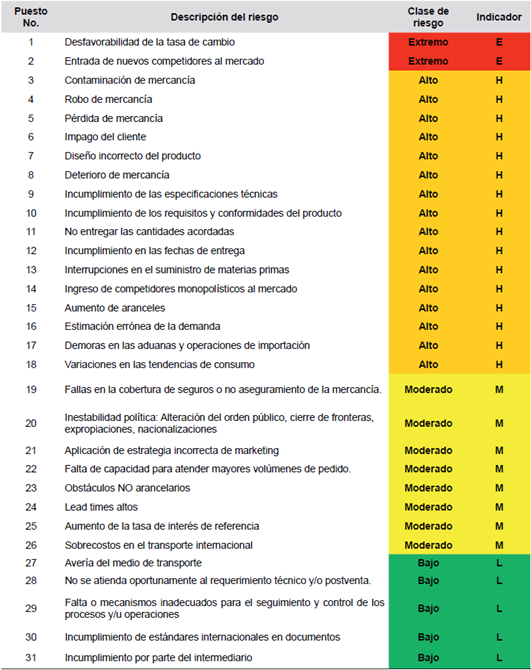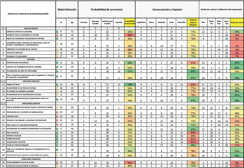 Con base en lo anterior, y mediante una encuesta aplicada a los empresarios de las Pymes exportadoras en la ciudad de Cartagena, se construyó el mapa de riesgo y el mapa de calor el cual permitió identificar los riesgos de mayor ocurrencia e impacto en las diferentes fases del proceso de comercialización internacional, revelando los siguientes: entrada de nuevos competidores al mercado, desfavorabilidad de la tasa de cambio del mercado, demoras en las aduanas y operaciones de importación, interrupciones en el suministro de materias primas, lead times altos y sobrecostos en el transporte internacional.