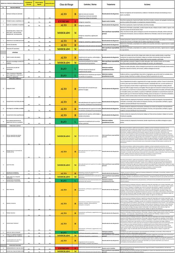 En este sentido, en el modelo se muestran los porcentajes arrojados en el mapa de calor (Tabla 7) en relación con la probabilidad de ocurrencia, grado de impacto negativo y grado de control, adicionalmente se clasificaron los riesgos de acuerdo con la matriz de análisis cualitativo (Tablas 8, 9 y 10), una vez determinado lo anterior se establecieron los controles/alertas, tratamientos y acciones a tomar por cada riesgo, que permita al empresariado tomar la posible mejor decisión al momento que estos se presenten durante cada fase del proceso de internacionalización.