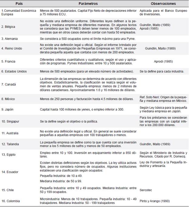 La definición de Pymes en el ámbito mundial no está estandarizada y es muy variable; su caracterización está dada a través de criterios cuantitativos (asalariados o número de trabajadores, ventas y capital) y cualitativos (propiedad, independencia de la firma y participación o dominación del mercado). Aunque innumerables autores definen, difieren y sugieren sobre su conceptualización, algunos establecen unas definiciones internacionales de Pymes solo como referencias para su estudio (Ver Tabla 3).