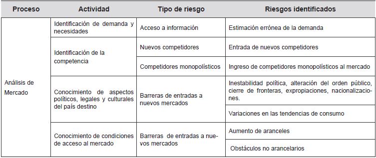Es preciso resaltar que dentro del análisis del mercado se evalúan los componentes de la demanda, necesidades del mercado, competencia, aspectos políticos legales y culturales del país destino y las condiciones de acceso al mercado, los cuales permiten disminuir en lo posible y en un mayor grado el espectro de incertidumbre que conduzca a una toma o un conjunto de posibles mejores decisiones (Arese, 1999; Galvis, 2008; Kirchner, 2010; Czinkota y Ronkainen, 2007; Milesi, 2007; Fortater, MacGillivray y Raynard, 2006).
