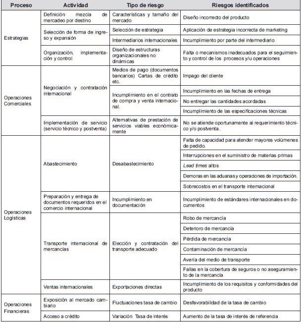 Se puede colegir con esta investigación la importancia derivada de las Pymes exportadoras de la ciudad de Cartagena para jalonar el crecimiento y desarrollo de la región, en la cual se resaltan los procesos que definen las fases del comercio exterior en las Pymes en Cartagena, tales como análisis del mercado, estrategias, operaciones comerciales, operaciones logísticas y operaciones financieras, que permitieron identificar los riesgos relacionados con cada una de las actividades del proceso. Se destacan los siguientes riesgos que presentaron mayor impacto: entrada de nuevos competidores 66%, desfavorabilidad de la tasa de cambio 63% y demoras en las aduanas y operaciones de importación 47%. Asimismo los riesgos que mostraron mayor aversión: contaminación de la mercancía (85%), robo de la mercancía (84%), pérdida de la mercancía (82%), impago del cliente (82%), desfavorabilidad de la tasa de cambio (78%) y entrada de nuevos competidores (76%). Finalmente, se detallan los riesgos de mediana incidencia o impacto: incumplimiento por parte de los intermediarios (65%), incumplimiento de estándares internacionales en documentos (67%) y falta o mecanismos inadecuados para el seguimiento y control de los procesos y/u operaciones (74%).