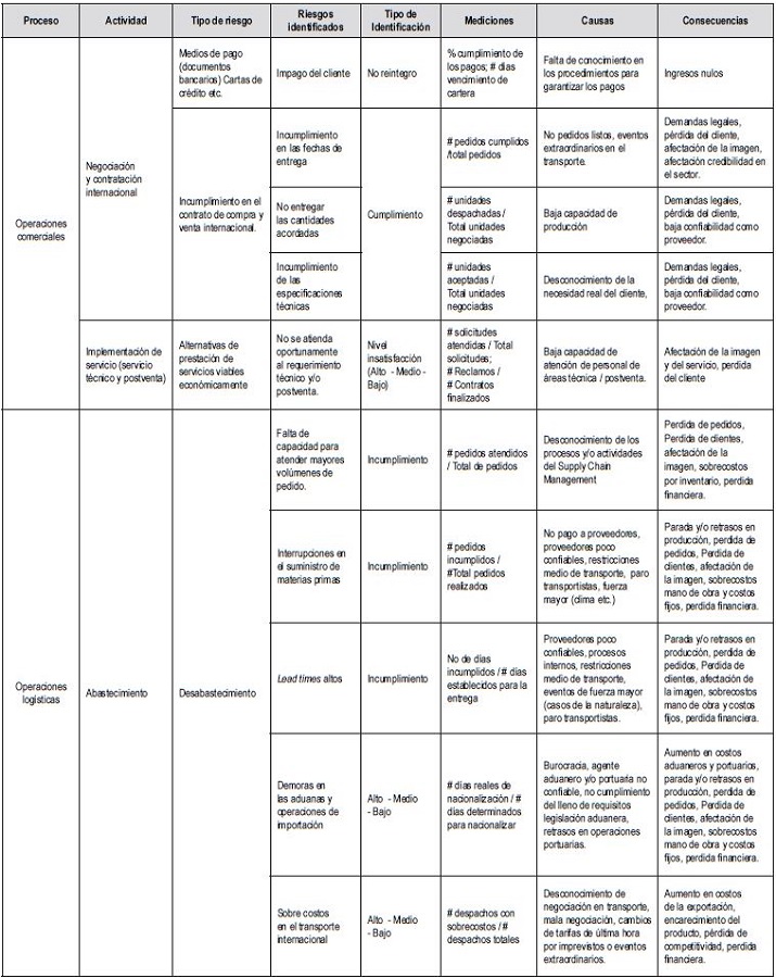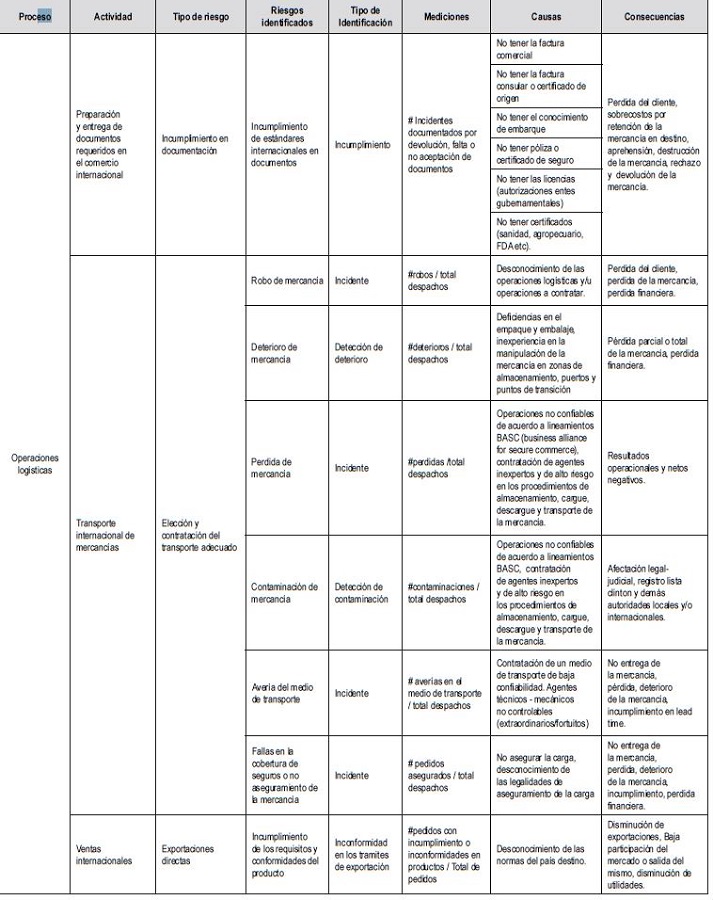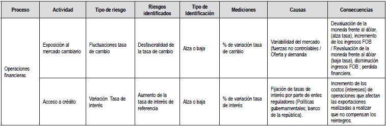 En la Tabla 6, se observa el mapa de riesgos de las Pymes exportadoras en Cartagena durante el periodo 2013-2015, el cual permite visualizar el riesgo al que han estado expuestos los empresarios en cada de una de las fases del comercio exterior, de acuerdo con las encuestas realizadas en el desarrollo de esta investigación. Igualmente, este mapa deriva del inventario de los riesgos de la Tabla 5, el cual permite identificar los procesos, actividades, tipo de riesgos, riesgos identificados; considerando autores que referencian el tema y los casos reales materializados durante el proceso de comercialización internacional de mercancías.