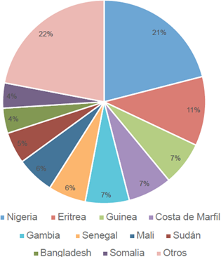 En el 2016, nacionales de Eritrea y Guinea aumentaron en 11% y 7% respectivamente, detrás de Nigeria que presentaría un 21% (Figura 10), de igual forma estaban países como: Costa de Marfil (7%), Gambia (7%), Senegal (6%), Malí (6%), Sudán (5%), Bangladesh (4%), Somalia (4%), y finalmente otras nacionalidades con un 22%. Sin embargo, en 2017 se redujeron las llegadas de Eritrea, Sudán y Gambia a pesar de que han aumentado los arribos por el mar, mientras que las de Costa de Marfil, Senegal, Marruecos, Nigeria, Mali y Guinea siguen creciendo (Missing Migrants, 2017)