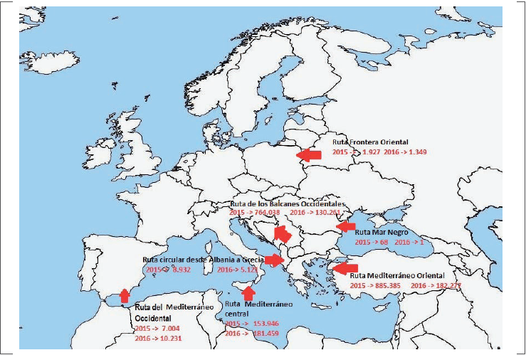 Las detenciones Ilegales en las fronteras de la Unión revelaron cambios a lo largo del 2016 (Figura 2); durante ese año se realizaron "511.371 determinaciones por parte de los Estados miembros de la UE, una disminución del 72% en comparación con 1,8 millones de detenciones en 2015" (Frontex, 2017, p.18). Las rutas del Mediterráneo occidental y central se vieron expuestas a aumentos de 3.227 y 27.513 detenciones ilegales, respectivamente. En contraste, está la ruta del Mediterráneo oriental que presentó 703.108 solicitudes menos que en el 2015, tal disminución está ligada a la declaración UE-Turquía, firmada en marzo del 2016, en la cual se establece el trabajo de este país en las fronteras marítimas y terrestres, fortaleciendo la capacidad de reasentamiento de aquellos migrantes que sean devueltos. Creando así una cultura de desaliento y eliminando el incentivo para que los migrantes tomen rutas irregulares, debilitando el modelo de negocios de las redes de contrabando de personas.