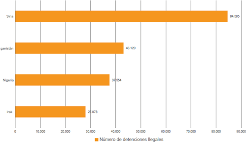 Siria y Afganistán siguen liderando los índices migratorios (Figura 3). En cuanto a nivel de detenciones ilegales se presentaron 84.585 y 43.120, respectivamente durante el 2016, las cuales se centraron principalmente en la ruta del Mediterráneo oriental, seguido de Nigeria con 37.554 detenciones efectuadas en la ruta del Mediterráneo Central, sobrepasado a Irak en la zona oriental del Mediterráneo.