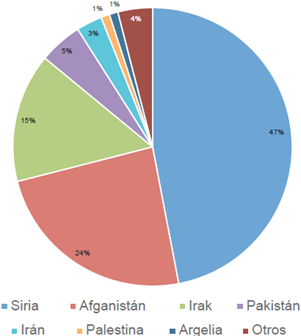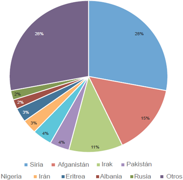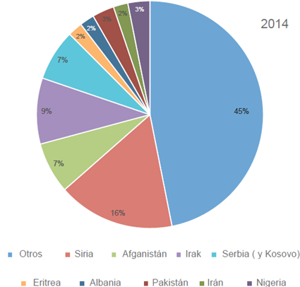 El aumento en los flujos migratorios traería consigo el incremento de solicitudes de asilo en el 2015 comparado con 2014 (Figura 4), encabezado por ciudadanos pertenecientes a Siria con un 24%, seguido de Afganistán con 16%, e Irak con 12%. Este incremento se materializó por los problemas de seguridad en estos territorios, junto con las nuevas rutas de contrabando del Mediterráneo Oriental y la Occidental de los Balcanes. Lo anterior generó un número de solicitantes de asilo que no se veía desde la Segunda Guerra Mundial.
