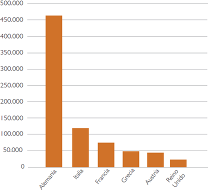El 2016 contó con 722.300 solicitudes que por primera vez fueron registradas, estas se centraron en países como (Figura 6): Alemania con un 60%, seguido de Italia con 16%, Francia 10%, Grecia 6%, Austria el 5% y finalmente Reino Unido con solamente 3%. Permitiendo denotar el papel preponderante que tiene Alemania al momento de dar ayuda para disminuir la crisis en toda la Unión.