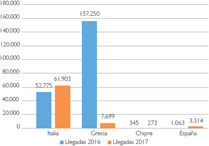 En 2017 se ha presentado una disminución en el número de migrantes que han arribado a Europa, aproximadamente "73.189 migrantes han sido reportados hasta el 11 de junio de 2017, en donde un 85% ha llegado a Italia y el resto se ha encontrado dividido entre Grecia, Chipre y España", 138.244 migrantes menos de los presentados en las mismas fechas del año anterior (Missing Migrants, 2017).