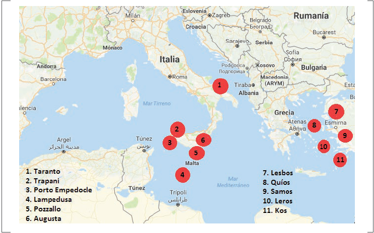 Según el Tribunal de Cuentas Europeo (2017) se definió como punto crítico a "la zona en la frontera exterior de la Unión Europea que se encuentra sujeta a presión migratoria de manera desproporcionada", en donde la mayoría de migrantes ingresa a la Unión y se hace necesario el plan de intervención establecido por la Comisión. Como se puede observar en el mapa (Figura 8) algunos de los más relevantes son: por parte de Italia, Taranto, Trapani, Porto Empedocle, Lampedusa, Pozzallo y Augusta; y por la frontera con Grecia, Lesbos, Quíos, Samos, Leros y Kos; puntos en los cuales se han presenciado los avances en cuanto a la gestión en temas migratorios mediante el aumento en la capacidad de acogida y la mejora en los procedimientos para el registro y las acciones de apoyo (p.14).