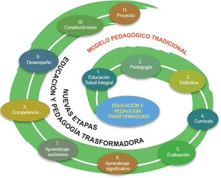 La Pedagogía debe estar centrada en la relación profesor-alumno. Es la Pedagogía Moderna Transformadora (lafrancesco, 2015), en donde se favorece la visión integral del ser y la realidad observada del entorno. Esto contrasta la visión de formar un médico o un profesional para que cumpla con los contenidos enseñados y, mezclados a manera de "pegamentos académicos", tal como se ha observado en los contenidos de las escuelas de formación de Medicina Familiar en Colombia. Para superar este antiguo enfoque centrado en el profesor y el alumno, con unos contenidos programáticos y unos énfasis de enseñanza, calificación y promoción académica totalmente superados en el mundo de formación del talento humano, se propone este modelo; éste permite que el estudiante construya su propio conocimiento, transforme la realidad socio-cultural y resuelva los problemas de su entorno (lafrancesco, 2011). Teniendo en cuenta esta premisa, el estudiante deja de ser pasivo y se convierte en protagonista de su aprendizaje, pasando el docente a ser un guía (Figura 1).