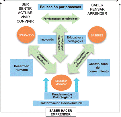 La dinámica de formación de esta propuesta, destaca: una educación por procesos, un enfoque de desarrollo humano, la construcción del conocimiento, la innovación educativa y pedagógica, los fundamentos sociológicos y la transformación socio-cultural. Éste modelo ubica entonces al educando, a un educador como mediador y a unos saberes que garanticen, a nivel de los profesionales y las comunidades, competencias del Ser, del Saber, del Sentir, del Pensar, del Vivir y Convivir, del Aprender y del Aprender a Desaprender, para con ello Saber Hacer y Emprender el camino en la cultura de la salud.