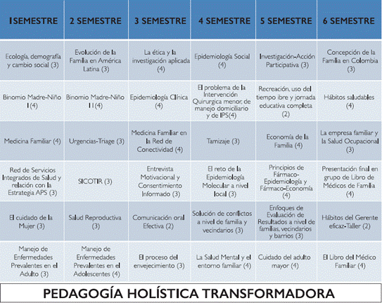 En el contexto de la pedagogía transformadora holística se propone una integración de las áreas de la medicina, -que clásicamente se tratan como elementos independientes- Se integran: binomio madre-hijo, la medicina en una visión familiar, la mujer en el contexto de cuidado integral, la concepción del enfoque de familia, el envejecimiento, etc. Todas estas concepciones apuntan hacia la construcción de hábitos saludables