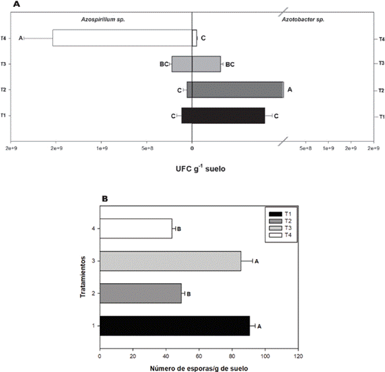 De modo general, Azospirillum sp. fue más abundante que Azotobacter sp. en cada uno de los tratamientos (Figura 1A). El recuento bacteriano reflejó mayor presencia de Azospirillum sp. (2,0 x I09 UFC) en el tratamiento con fertilización de síntesis química (T4) y menor en T2 (gallinaza compostada) con 5,0 x107 . Al comparar con estudios similares la densidad es alta (Pulido et al., 2003; Mujiyati, 2009). Este grupo bacteriano se caracteriza por ser de alta motilidad y poseer metabolismo versátil para la obtención de fuentes de C y N, contribuyéndole adaptación para establecerse en el entorno competitivo de la rizosfera y cambios rápidos en las condiciones ambientales (Hartmann & Zimmer, 1994). Azotobacter sp. presentó mayor presencia en T2 con 1,0 x107 UFC y la densidad más baja 2,0 x 105 en T4, contrario a lo observado en Azospirillum sp. (Figura IA). A pesar de la diferencia entre tratamientos se considera una densidad poblacional alta considerando estudios reportados por Martyniuk & Martyniuk, (2002) y Córdova et al., (2009), quienes indican que este género rara vez excede varias miles de células por gramo de suelo, principalmente en suelos de regiones tropicales donde no es común encontrar cifras mayores de 103 UFC. Cassetari et al., (2016) en el trabajo sobre fijación biologíca de nitrógeno asociativa y de vida libre, enfatiza sobre la gran diversidad funcional de Azotobacter sp.y Azospirillum sp.y su potencial como bioindicadores en alteraciones ambientales.