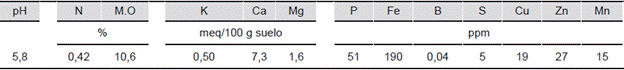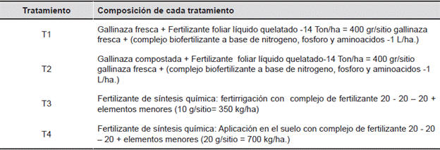 En el experimento se utilizó un diseño de bloques al azar, con cuatro tratamientos (Tabla 1) a partir de requerimientos en fertilización del cultivo y el análisis de suelos (Tabla 2)