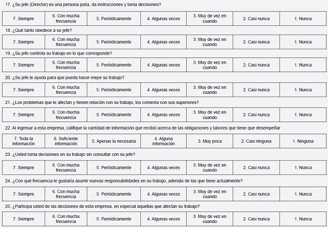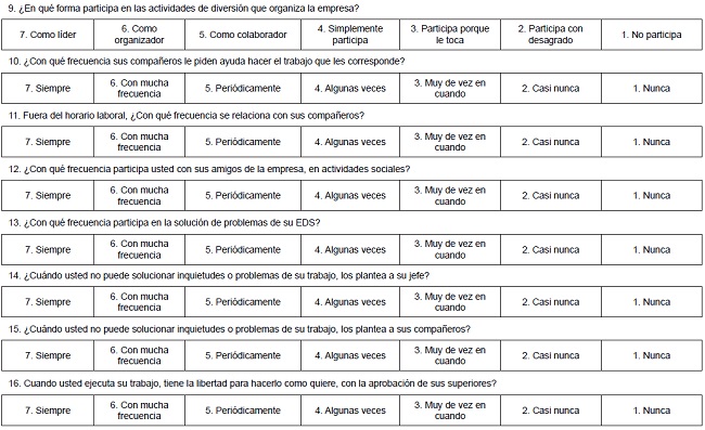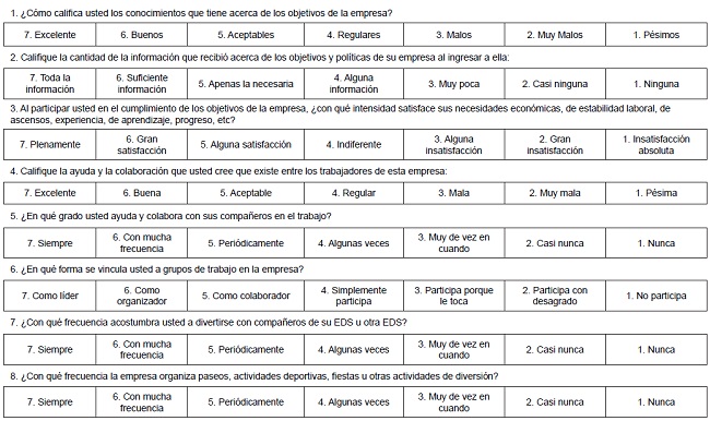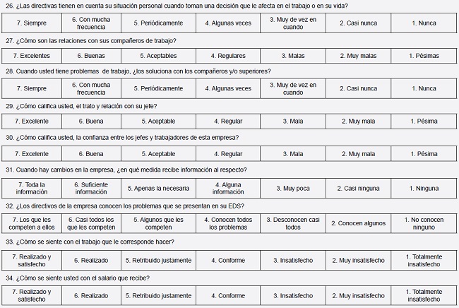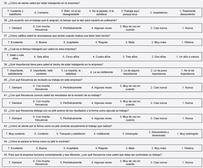 Las respuestas se cuantifican en una escala Likert de 7 opciones. Las respuestas 5, 6 y 7 describen un clima organizacional favorable. La opción 4 es considerado neutro. Las respuestas 1, 2 y 3 describen un clima organizacional desfavorable. La encuesta aplicada se muestra en los anexos.