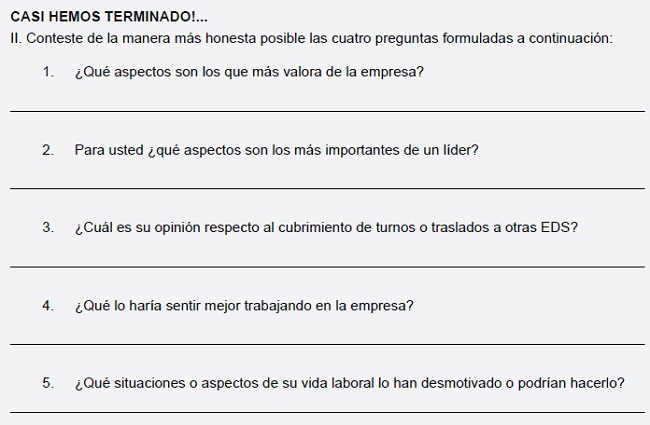 De manera independiente al instrumento de medición de clima organizacional IMCOC, se realizó una encuesta de 5 preguntas abiertas cuyos resultados nos dieron información muy valiosa. En primera instancia se pudo concluir que el cumplimiento en el pago de salarios es muy valorado por los trabajadores. La organización los efectúa sin retraso aun cuando en ocasiones se presentan inconvenientes con el flujo de caja. También es evidente que para los colaboradores, la percepción de liderazgo en la empresa está mayormente relacionada con la disposición para escucharlos y que se tengan en cuenta sus observaciones.
