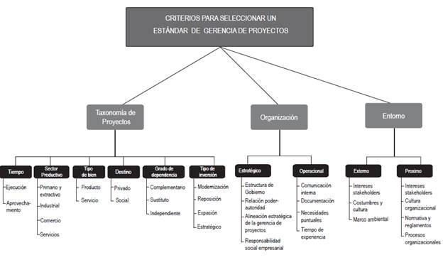 Con respecto a los criterios que se podrían tener en cuenta para tomar decisiones relacionadas con el estándar, metodología, método, entre otros, a utilizar por una compañía y/o un proyecto, a continuación se propone un esquema elaborado a partir de los referentes encontrados en la literatura. Estos, en general, son criterios técnicos, pero de la propuesta se desprenden dos criterios habilitantes, que son de un orden superior: la RSE y por consiguiente, la sostenibilidad empresarial.
