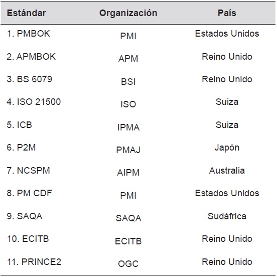 En cuanto a los estándares relacionados con la gerencia de proyectos, existe una lista amplia de ellos (Tabla 1), cada uno con sus particularidades, ventajas y desventajas, que deben ser analizadas para decidir acerca de su aplicación en un proyecto determinado.