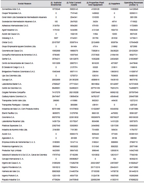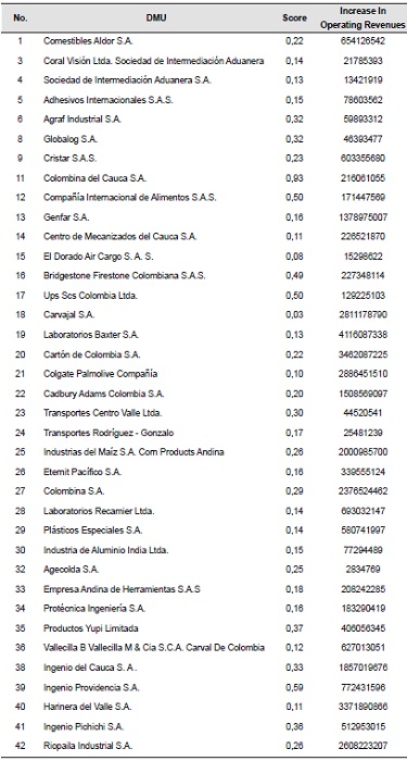For this study of efficiency, 42 companies certified in BASC Cali-Colombia were taken into account, and the information associated with the financial items, collected in the Superintendency of corporations of Colombia in 2014. Table 1 shows the companies that were considered for this investigation. For which there was special care in the choice of the input and output variables. It was worked with an approach to outputs, and the performance of these was analyzed.