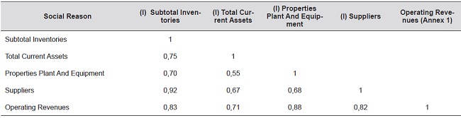 It can be seen that there is a high correlation of SUBTOTAL OF INVENTORY with suppliers (0.92), with OPERATING REVENUES (0.83); PROPERTY PLANT AND EQUIPMENT with OPERATING REVENUES (0.88) and SUPPLIERS with OPERATING REVENUES (0.82), on the other hand, the input variable with less correlation with output variables is PROPERTY PLANT AND EQUIPMENT. What evidence the relevance and correspondence between the selected variables.