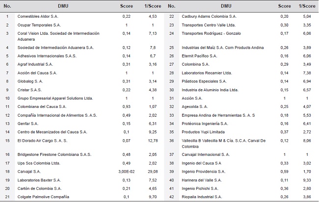 For the calculation and analysis of the results the software DEA Solver PRO was used, with which in an specific framework the input and output variables, previously established for each company or DMU, were analyzed, with that it was able to calcute the efficiencies for the population under study. Table 1 shows the values (magnitude) of the input and output variables for each of the companies considered in the study.