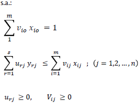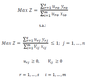 This model is expressed mathematically as it follows, if Yo = (ylo, y2o, y3o.....yso) and Xo = (xlo, x2o, x3..... xmo), represent the inputs and the outputs of the DMUo respectively, the measure of efficiency of the unit being evaluated can be obtained with the optimal solution of the following model: