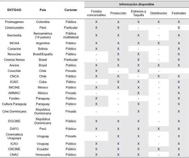 Por último, se recurrió a plataformas virtuales, independientes u oficiales de diferentes países de la región relativas al sector cinematográfico, donde fue posible obtener datos referentes a: fondos concursables, producción, estrenos (nacionales) y taquilla, distribución y festivales. Tales criterios fueron obtenidos al observar y estudiar la información asociada a la comercialización cinematográfica presente en tales sitios. Lo que ayudó a comparar la realidad del sector en Colombia con las demás naciones de la zona, a la vez que permitió una mejor comprensión del rol de los sectores público y privado en la industria estudiada.