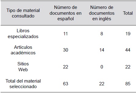 Se hizo necesario, previo a la sistematización, depurar la información obtenida, pues "Una de las consecuencias de la sociedad de la información y el conocimiento es la sobreoferta de información, divulgada a través de los diversos medios, la mayoría de ellos tecnológicos" (Pérez Rave, 2013, p. xiii) destacando que en ocasiones se encontró material que parecía promisorio pero, debido a que este solo hacía menciones esporádicas de la temática estudiada, no lograba cumplir los requisitos de contenido necesarios para el análisis, lo que llevó a su supresión. Debido a ello, se obtuvo el tipo de material expresado en la Tabla 3.