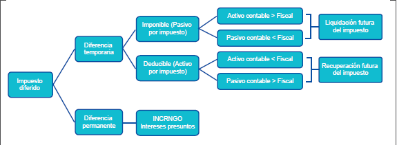 Las diferencias temporarias (o temporales) provienen de las diferencias en las políticas de medición por causación y ajustes de los activos y pasivos, o de los ingresos, costos y gastos, en la contabilidad fiscal y contable. Estas diferencias hacen que el impuesto corriente (base fiscal), y el gasto impuesto (base contable) sea diferente; la variación entre estos valores, se reconoce como impuesto diferido.