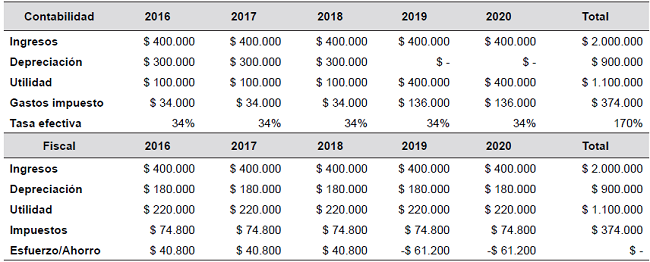 Enunciado: La empresa Ejemplo S.A. genera ganancias contables por $400.000 u.m. durante cinco años; adquiere un activo por $900.000 u.m. Fiscalmente se deprecia a 5 años (límite de vida útil Art. l 37 E.T7) y contablemente a 3 años (Ver Tabla 1).