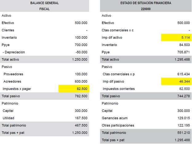 El impuesto corriente de la contabilidad fiscal se incorpora también en la contabilidad NIIF (en la categoría de impuesto corriente), reemplazando el valor del gasto impuesto, al ser estos valores distintos -porque son traídos de ecuaciones contables diferentes- la partida doble de la ecuación NIIF queda descuadrada. La diferencia entre el impuesto corriente y el gasto impuesto es balanceada en la contabilidad NIIF con la causación del impuesto diferido. Si el impuesto corriente es mayor que el gasto impuesto, la variación es un activo por impuesto diferido. De lo contrario, si el impuesto corriente es menor que el gasto impuesto, la variación es un pasivo por impuesto diferido.