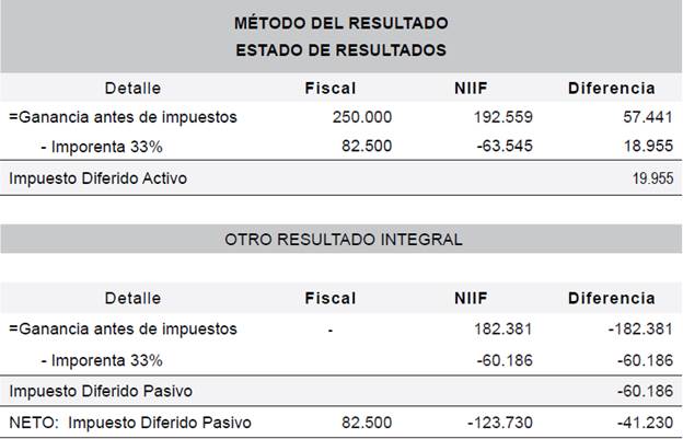 El método del resultado entrega un valor neto activo o pasivo del impuesto diferido. Pero las secciones 2.52 y la 29.29, no permiten compensar el impuesto corriente activo y pasivo, ni los impuestos diferidos activos y pasivos. Por lo que se debe presentar el impuesto diferido activo y el impuesto diferido pasivo por separado. Por esa razón, se debe calcular por el método del pasivo, reconocido también por el método del balance (Ver Tabla 25).