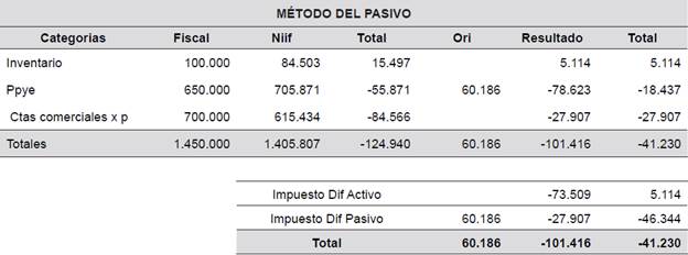 El valor del impuesto diferido calculado en el método del resultado, y el valor neto calculado en el método del pasivo, deben coincidir.